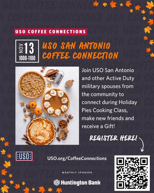 Join USO San Antonio and other Active Duty military spouses from the community to connect during Holiday Pies Cooking Class, make new friends and receive a Gift!