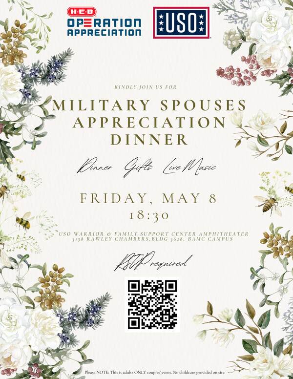 Military spouses, this day is for YOU! Join USO San Antonio for Appreciation Dinner Date, as we celebrate your strength, resilience, and the incredible role you play in the military community.