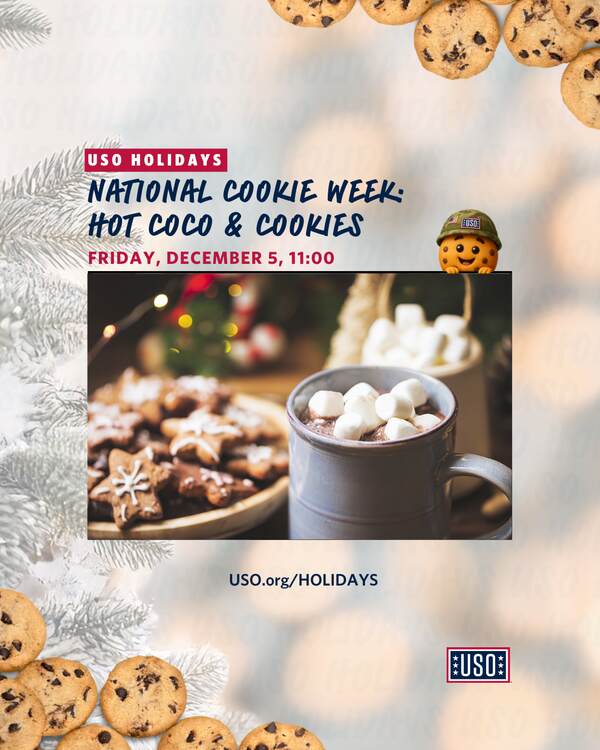 Celebrate #USOCookieWeek with USO Warrior & Family Support Center on Friday, December 5th at 11am with HOT COCO & HOLIDAY COOKIES. #USOHolidays